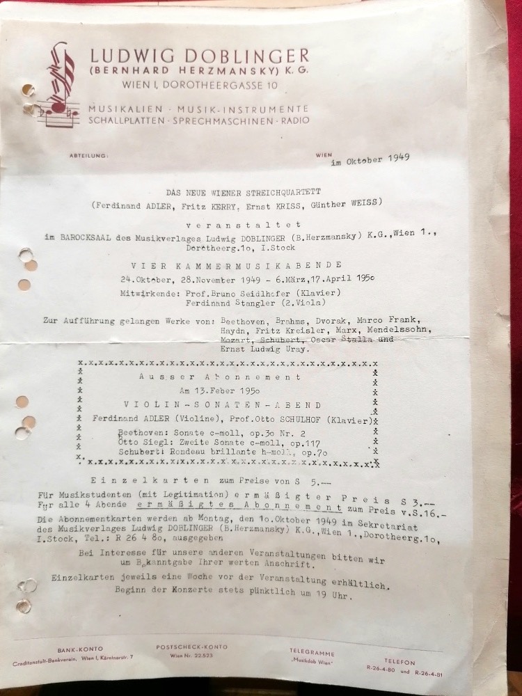 In addition, on February 13, 1950, Adler was to perform a recital with pianist Otto Schulhof, of Beethoven’s Violin Sonata No. 7, Otto Siegl’s Second Sonata in C Minor, and Schubert’s Rondeau Brillante in B Minor. All these at the Barocksaal - the 110-seat concert hall at the Musikhaus Doblinger.